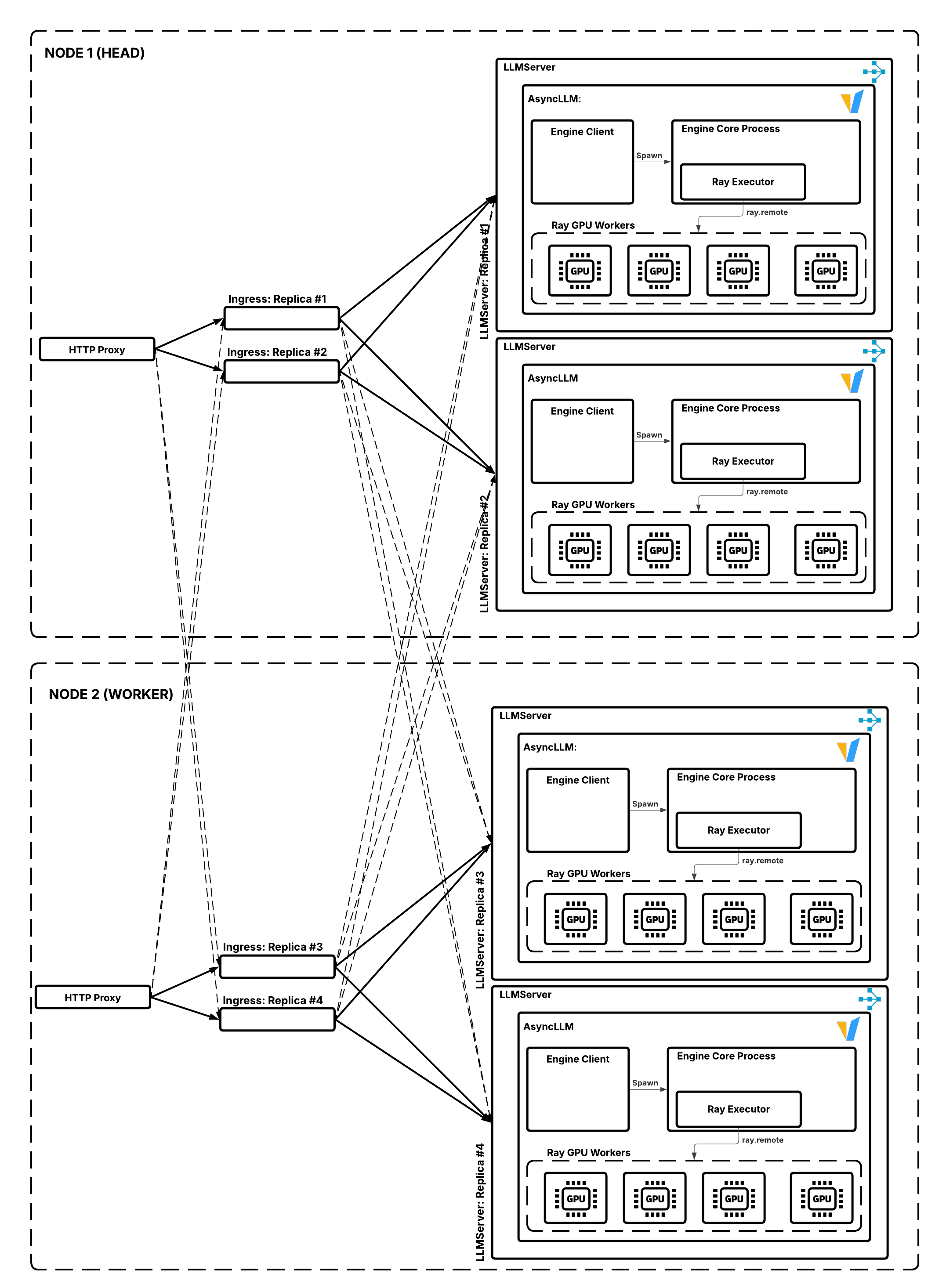 从入口到 LLMServer 副本的请求路由。实线表示首选的本地 RPC 调用;虚线表示当本地副本繁忙时可能发生的跨节点 RPC 调用。#