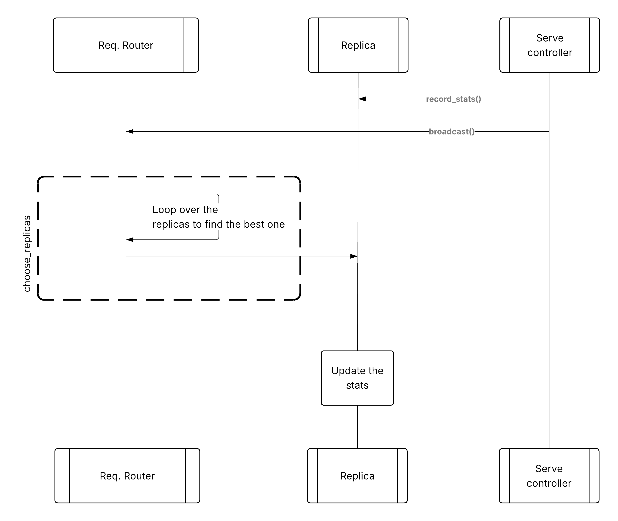 在此方法中,Serve 控制器轮询每个副本以获取本地统计信息,然后将它们广播到其部署句柄上的所有请求路由器。然后,请求路由器可以使用此全局广播的信息来选择正确的副本。请求到达副本后,副本会更新其本地统计信息,以便在控制器下次轮询时将其发送回 Serve 控制器。