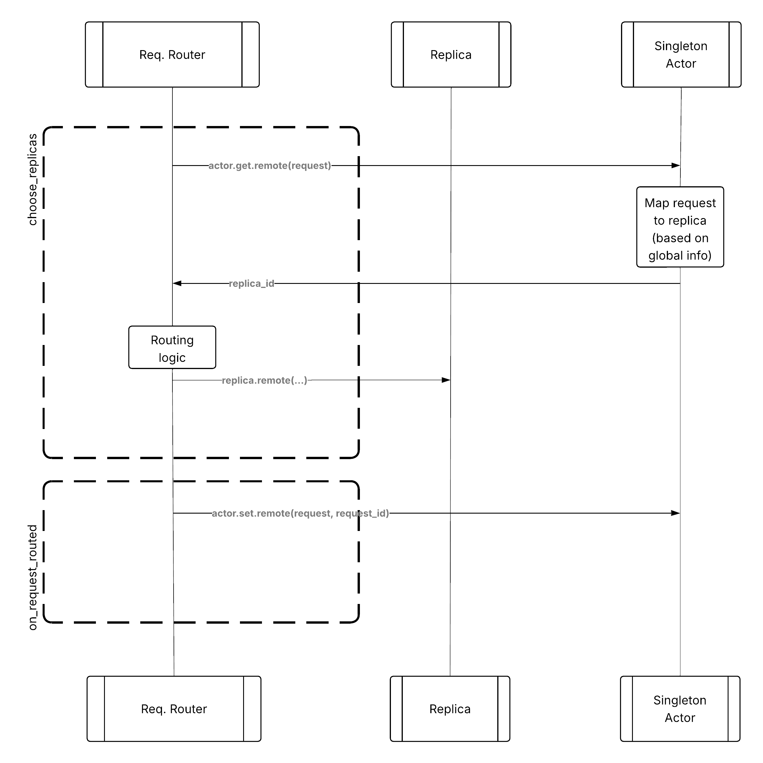 choose_replicas():选择哪些副本应处理请求。on_request_routed():成功路由请求后更新路由器状态。on_replica_actor_died():副本死亡时清理状态。
