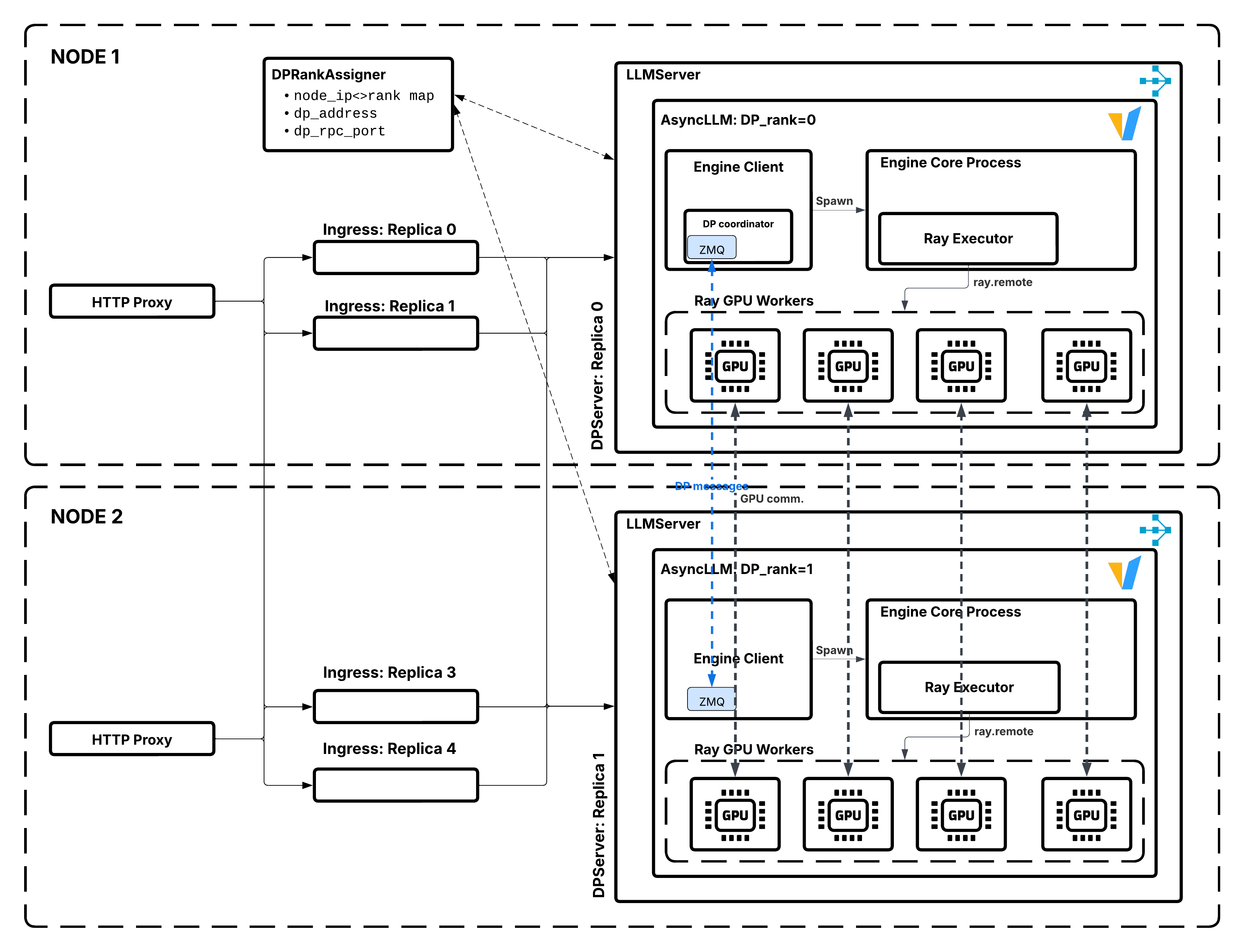 dp_size个 LLM 服务器的副本。每个副本都运行一个独立的、具有相同模型的推理引擎。